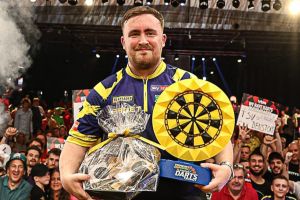 אלוף העולם בדארטס חגג ניצחון יוקרתי - אבל מה שגנב את ההצגה היה אחד הפרסים שקיבל: סלסלת עוגיות ענקית לצד גביע ו-30 אלף ליש"ט