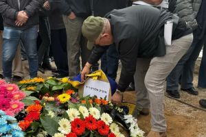 משפחתו של החטוף שנרצח בשבי וגופתו הושבה מעזה הציבה את הצעיף של קבוצתו האהובה על קברו הטרי בטקס הלוויה בניר עוז