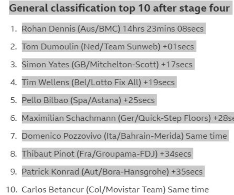 גם רוהן דניס האוסטרלי נתן ספרינט לקראת הסוף והצליח לשמור על ההובלה בג'ירו – 14:23.08 שעות, בשנייה בלבד לפני טום דמולין. וולנס התקדם בעקבות ניצחונו למקום הרביעי הכללי. כריס פרום, אלוף הטור דה פראנס, כבר פתח פער של 57 שניות אחרי דניס.