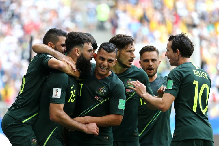 דקה 39, נבחרת אוסטרליה משווה ל-1:1! לקי נגח כדור לכיוון הפינה, יוסוף פולסן הרים את היד ולאחר סיוע משופטי הווידאו הוענק פנדל לאוסטרליה (שני שלה במונדיאל). ידינאק כבש מהנקודה הלבנה, הקשר הדני ספג כרטיס צהוב משחק שני ברציפות בעקבות פנדל שני שביצע בטורניר וייעדר מהמשחק הבא מול צרפת.