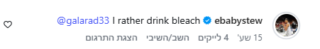 בפוסט באינסטגרם של מנהלת הליגה, בו דיבר סטיוארט על העונה שהוא חווה עד כה ועל החוויה שלו בהרצליה, ענה הכוכב לבקשת האוהד: "להגיע לחולון? אני מעדיף לשתות אקונומיקה".