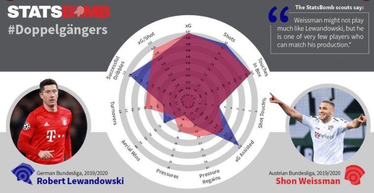 "וייסמן אולי לא מגיע לרמת המשחק של לבנדובסקי, אבל הוא אחד השחקנים היחידים שיכולים לייצר תפוקה כמו שלו", צוטט מי שמוגדר "הסקאוט של StatsBomb". לפי הנתונים, המתבססים על הבונדסליגה בגרמניה והבונדסליגה באוסטריה בלבד, בהחלט אפשר לראות שבכל הקשור לנגיעות ברחבה, בעיטות לשער ומספר בעיטות צפוי בכל משחק, המספרים די דומים – ללבנדובסקי כמובן יתרון, בכל זאת אחד החלוצים הטובים בעולם אם לא הטוב שבהם כיום, בעוד לוייסמן יתרון משמעותי בכל הנוגע ללחץ על שחקני ההגנה. כמובן שבכל הנוגע למאבקים אוויריים או לדריבלים מוצלחים, לבנדובסקי מוביל בפער עם נתונים עדיפים.