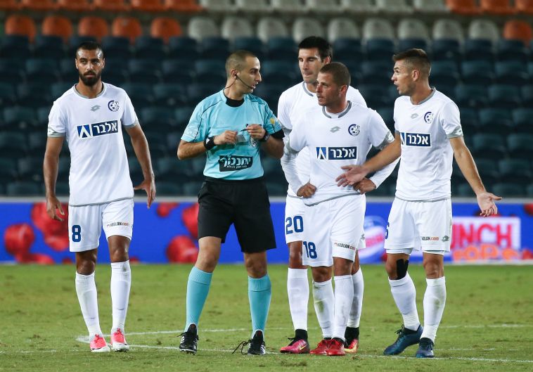 שחקני אשקלון מתווכחים עם השופט. לנעים זה כמעט עלה בהרחקה (דני מרון)