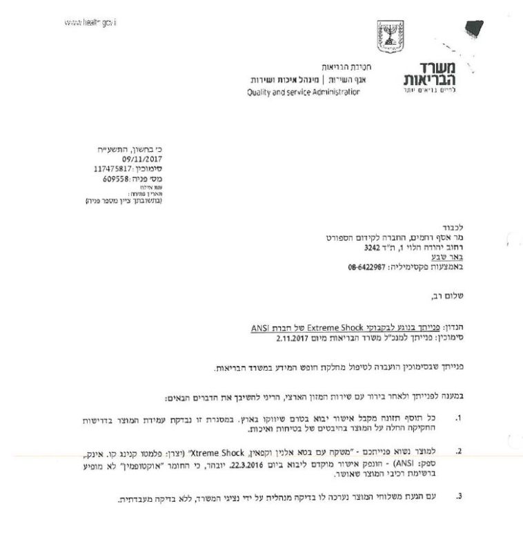 עוד לפי הודעת הפועל באר שבע, "התוסף 'אקסטרים שוק' מיוצר בארה"ב בשתי גרסאות: גרסה שמיועדת לשוק האמריקני ואשר עד לאחרונה הכילה אוקטופמין, ולצידה גרסה שונה באופן מהותי, שמשווקת בשוק הישראלי אשר לא מכילה אוקטופמין. משרד הבריאות אישר שהתוסף שאושר לשיווק בישראל אינו מכיל אוקטופמין ואכן בתווית שעל הבקבוק הישראלי ששיר שתה לא מצוין שהוא כולל אוקטופמין, בניגוד לתווית שעל הבקבוק האמריקני, שבה כן מצוין בפירוש הימצאות אוקטופמין. התוסף שהקבוצה רכשה שיובא על ידי המשווק המורשה בישראל הוא המוצר הישראלי, שכאמור לא אמור להכיל אוקטופמין".