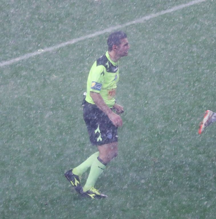 דקה 25, המשחק הופסק: לאחר התלבטויות רבות, אלון יפת הוריד את השחקנים מכר הדשא בגלל סופת ברד.