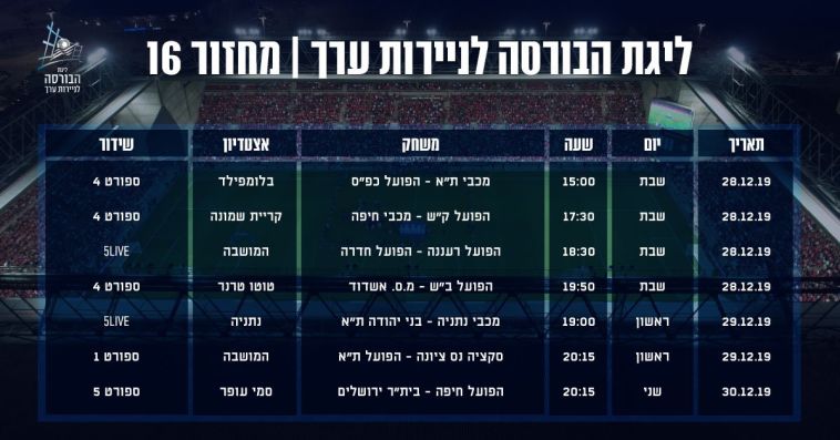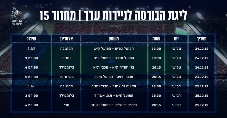 פיתחו יומנים. מנהלת הליגה פרסמה היום (חמישי) את המועד המדויק של מחזורים 15 עד 17 בליגת העל. גולת הכותרת היא המחזור ה-17 שכולל שני משחקים גדולים. מכבי חיפה תארח את האלופה מכבי תל אביב ביום שני בסמי עופר בתאריך ה-6 בינואר, כשכזכור בסיבוב הזה ניצחו הצהובים בזכות שער עצמי, ובמקביל תארח הפועל תל אביב את הפועל באר שבע באצטדיון בלומפילד (5.1, יום ראשון, שידור ישיר בספורט1) ותקווה לנקום על התבוסה 3:0 באצטדיון טוטו טרנר.