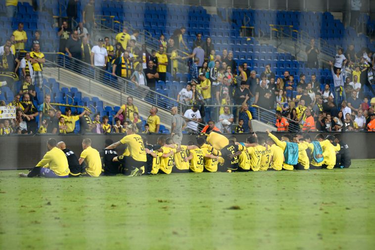 שחקני מכבי נתניה חוגגים עם הקהל. מחמאות לאוהדים (אריאל שלום)