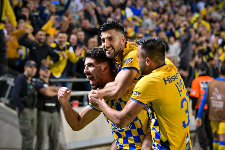 שחקני מכבי תל אביב חוגגים בסיום(אריאל שלום)