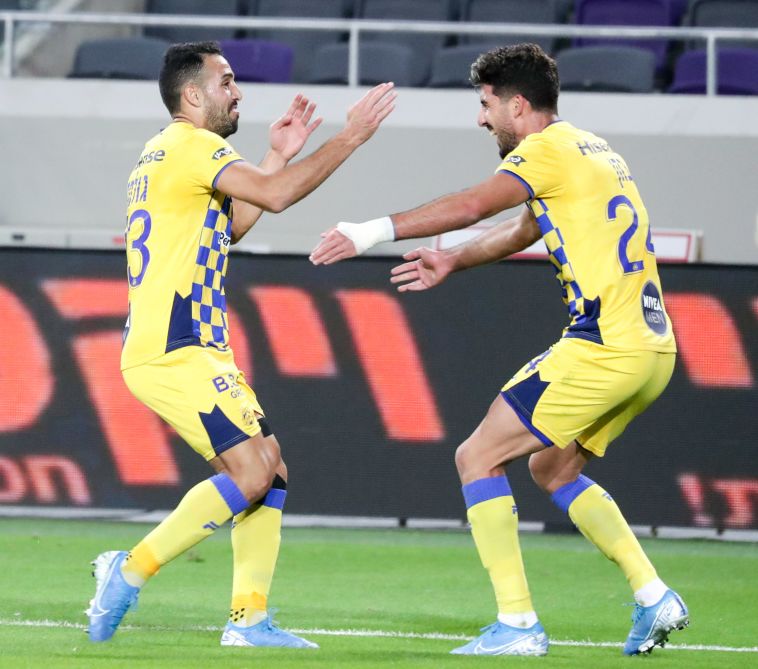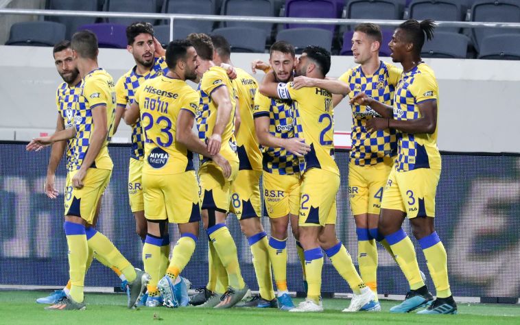 שחקני מכבי תל אביב חוגגים. בקבוצה שכחו מההדחה מהגביע (דני מרון)