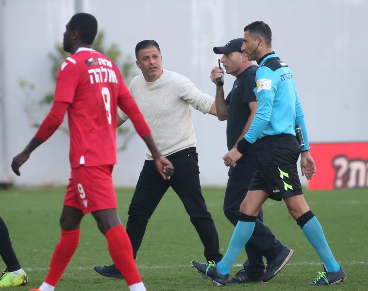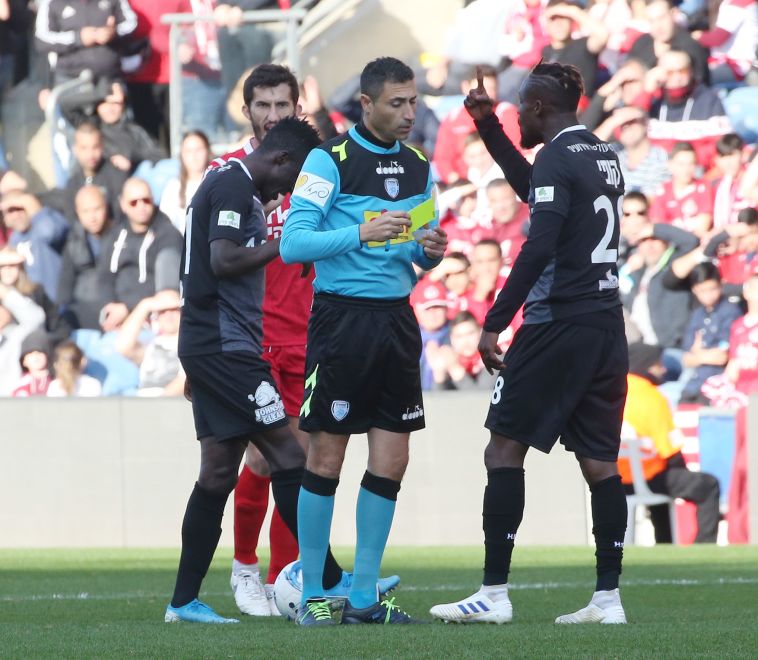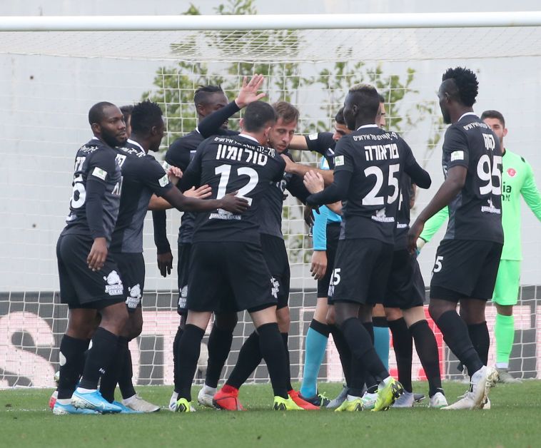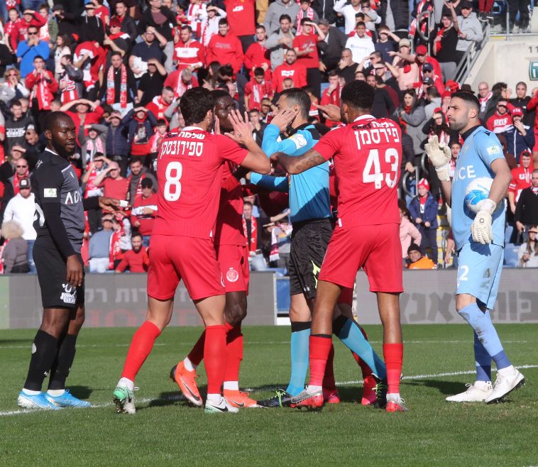שחקני הפועל תל אביב מקיפים את השופט (אודי ציטיאט)