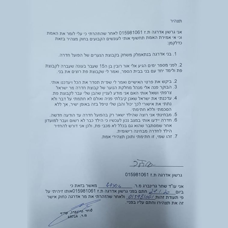 התצהיר עליו חתם אבי השחקן ביחד עם עו"ד שחר גרינברג (פרטי)