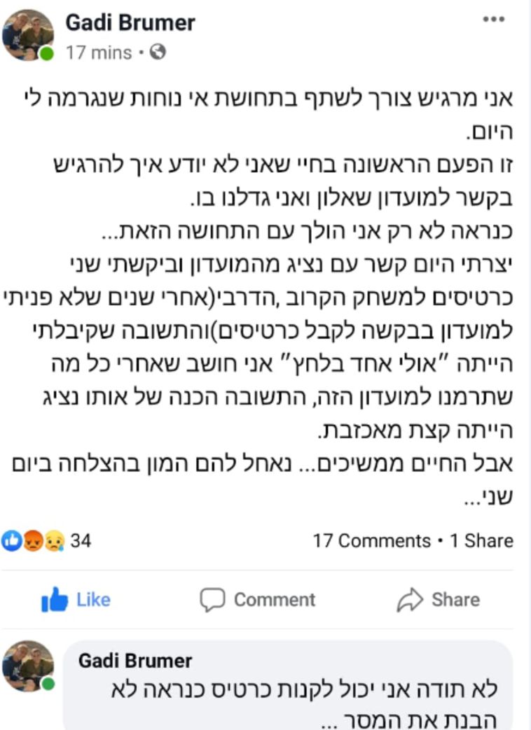 בתוך כך, היום היום חשף בלם העבר גדי ברומר כי נפגע מהתנהלות מכבי תל אביב לקראת הדרבי: "מרגיש צורך לשתף בתחושת אי נוחות שנגרמה לי. זו הפעם הראשונה בחיי שאני לא יודע איך להרגיש בקשר למועדון שאלון ואני גדלנו בו. כנראה לא רק אני הולך עם התחושה הזאת…יצרתי היום קשר עם נציג מהמועדון וביקשתי שני כרטיסים לדרבי (אחרי שנים שלא פניתי בבקשה לקבל כרטיסים) והתשובה שקיבלתי הייתה 'אולי אחד בלחץ'. אני חושב שאחרי כל מה שתרמנו למועדון הזה, התשובה הכנה של אותו נציג הייתה קצת מאכזבת. אבל החיים ממשיכים…נאחל להם המון בהצלחה ביום שני…".