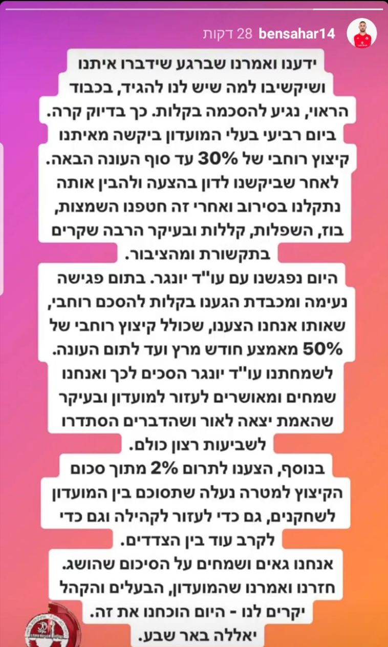 "היום נפגשנו עם עורך דין יונגר ובסיומה של פגישה נעימה ומכבדת, הגענו בקלות להסכם רוחבי שאותו אנחנו הצענו, שכולל קיצוץ רוחבי של 50% מאמצע חודש מרץ ועד לתום העונה. לשמחתנו עו"ד יונגר הסכים לכך ואנחנו שמחים ומאושרים לעזור למועדון ובעיקר שהאמת יצאה לאור".