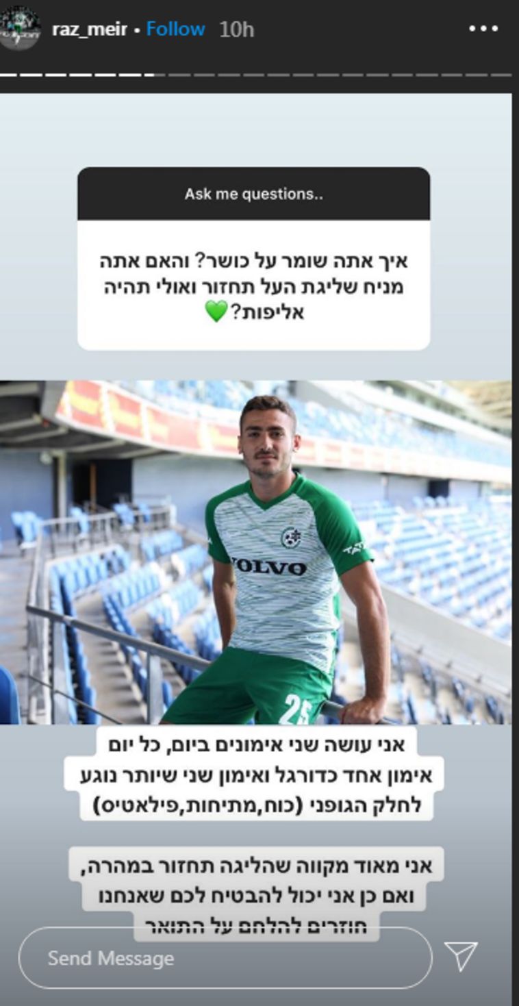 בזמן פגרת הקורונה הכפויה במכבי חיפה מקפידים לשמור על קשר עם האוהדים בזכות יוזמות כאלה ואחרות. הפעם היה תורו של המגן רז מאיר שבחודש דצמבר נפצע בצורה קשה. אתמול (ראשון) מאיר בן ה-23 ענה לשאלות האוהדים באינסטגרם וסיפר שהוא מרגיש מצוין והתאושש מהפציעה. עוד דיבר על המטרות לחמש השנים הקרובות ושיתף סודות מחדר ההלבשה.