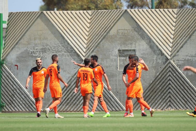 שחקני נס ציונה חוגגים את שער היתרון (הפועל תל אביב, רשמי)