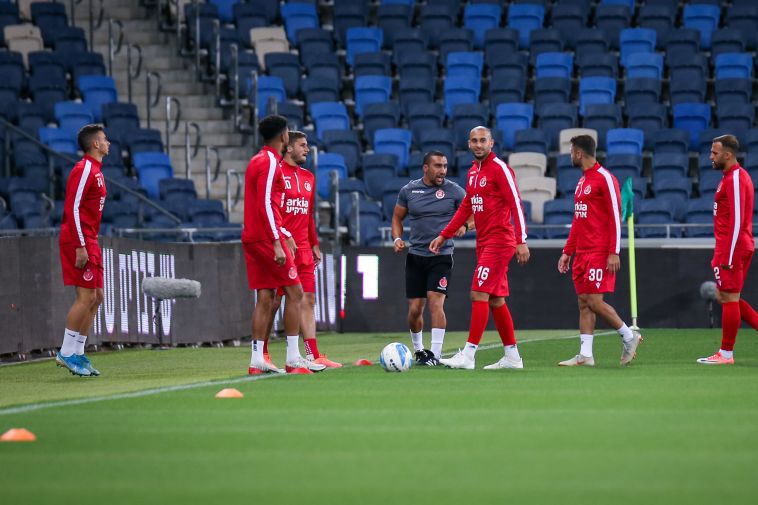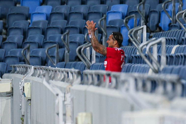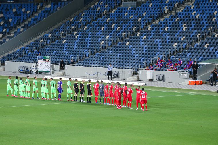 השחקנים נעמדים בפני אצטדיון ריק (מאור אלקסלסי)