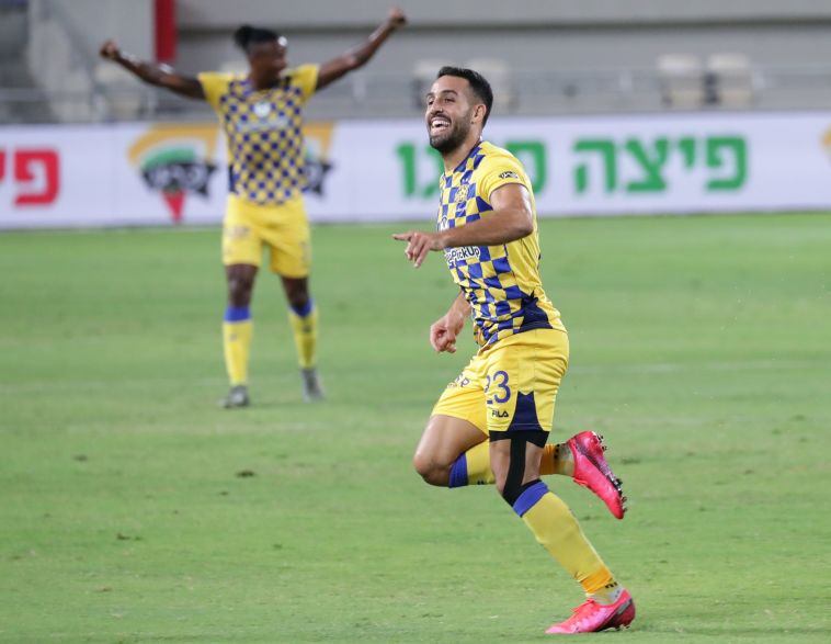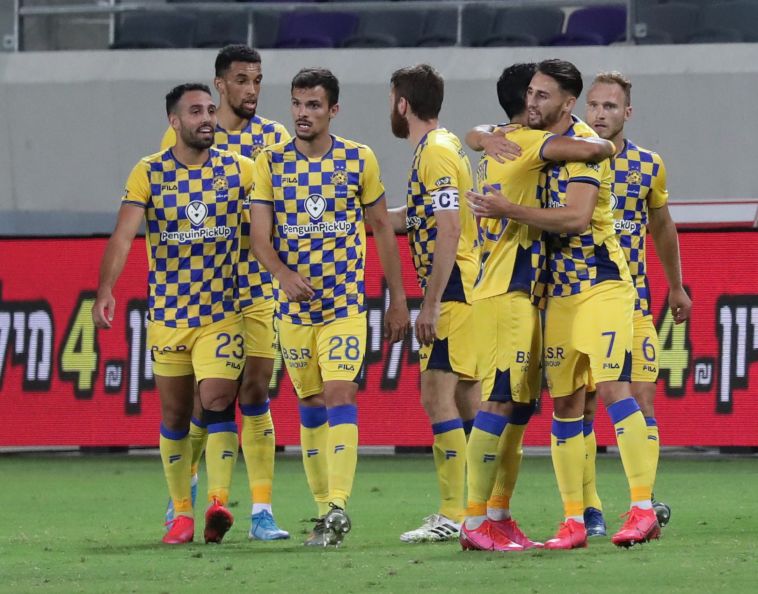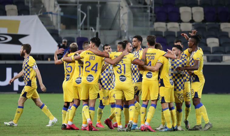 שחקני מכבי תל אביב חוגגים את השער השני. שוב מתן חוזז (דני מרון)
