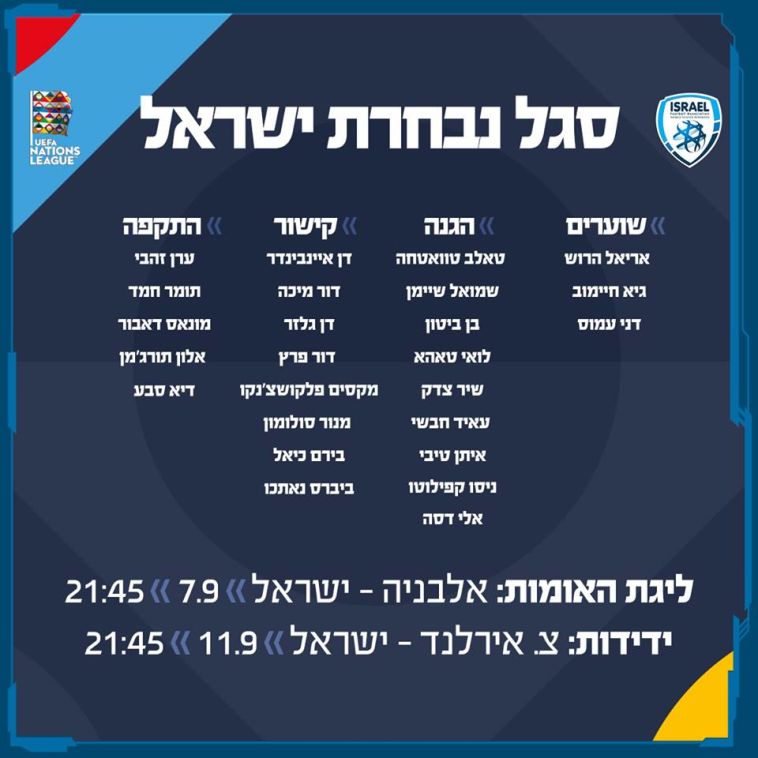 עידן המנהל הטכני וילי רוטנשטיינר והמאמן אנדי הרצוג ייצא לדרך רשמית ב-7.9.2018, כאשר נבחרת ישראל תתארח באלבניה במסגרת מחזור הפתיחה של ליגת האומות, הטורניר החדש של אופ"א שגם דרכו אפשר להשיג כרטיס ליורו 2020, והיום (שלישי) פרסם הצוות האוסטרי את סגל נבחרת ישראל לקמפיין הבא עלינו לטובה וגם למשחק הידידות בבלפסט מול צפון אירלנד (11.9).