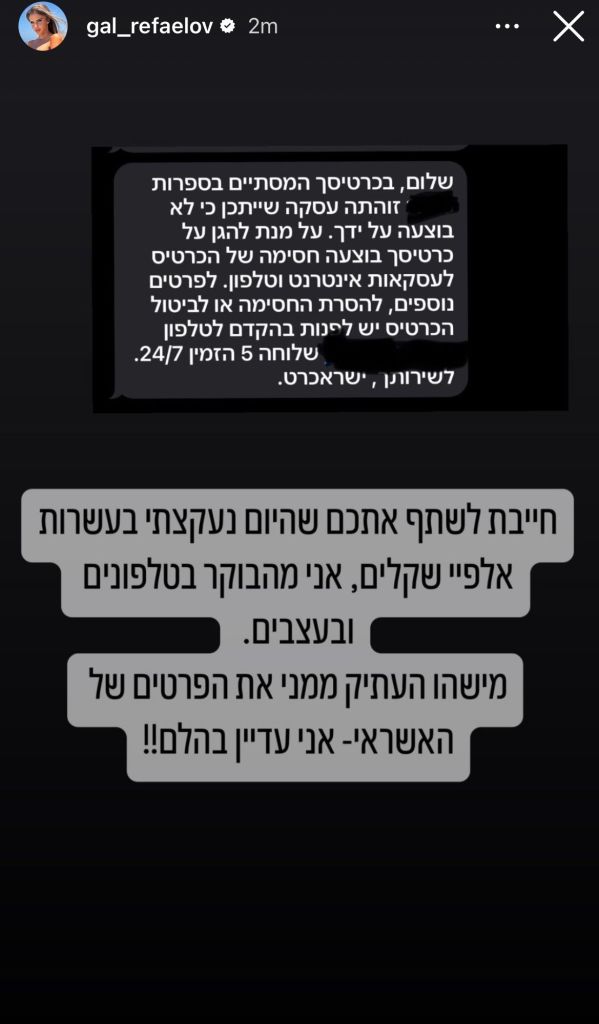 המשפיענית והדוגמנית גל רפאלוב, אשתו של קפטן מכבי חיפה ליאור רפאלוב, נעקצה בעשרות אלפיי שקלים. אשת הכדורגלן כתבה: "חייבת לשתף אתכם שהיום נעקצתי בעשרות אלפי שקלים ואני מהבוקר בטלפונים ובעצבים, מישהו העתיק ממני את הפרטים של האשראי ואני עדיין בהלם".