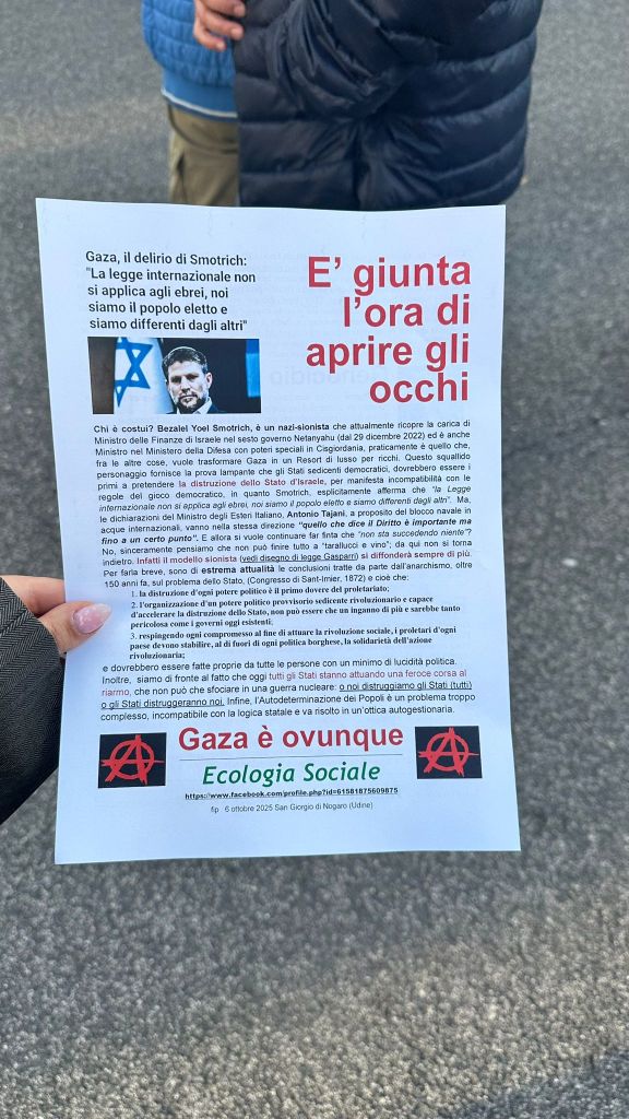 בהמשך מוזכרים אנטוניו טאיאני, שר החוץ האיטלקי, ועמדת ממשלת איטליה כלפי ישראל, שמתוארת כמתעלמת מהפרת זכויות אדם. הטקסט טוען ש"ישראל רוצה להמשיך עד שהיא תראה רק אש ויין", וש"אין דרך חזרה" כל עוד העולם שותק.