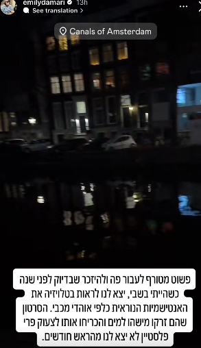 שורדת השבי אמילי דמארי, אוהדת מושבעת של מכבי תל אביב, פרסמה אמש (ראשון) סטורי באינסטגרם, שבו היא עומדת ליד הנהר באמסטרדם – שנה אחרי הפרעות הקשות שהתרחשו ברחבי הבירה ההולנדית, בהן הותקפו אוהדי הצהובים. באותו לילה נוראי, אולץ אוהד ישראלי לצעוק "פרי פלסטין" ואז הושלך לנהר הקפוא.