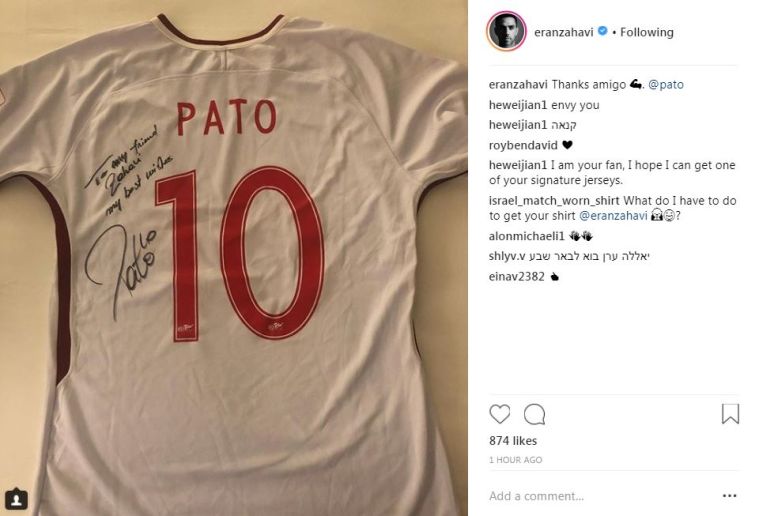 ערן זהבי פרסם בעמוד האינסטגרם שלו חולצת משחק של פאטו הברזילאי, ששיחק בעבר בין היתר במילאן ובצ'לסי ומשחק כיום בטיינג'ין קואנג'יאן הסינית, וכתב: "תודה חבר". הישראלי תייג את החלוץ שטרם הגיב.