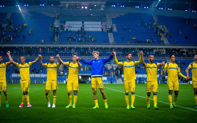 שחקני מכבי ת"א על רקע היציע המערבי שהתרוקן מיד עם השריקה