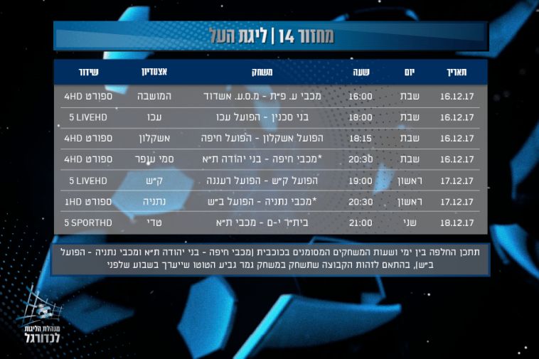 את המחזור ה-12 שיחל בשבת ה-2 בדצמבר תפתח מכבי תל אביב שתארח את אשדוד כבר בשעה 16:00. המשחק המרכזי יהיה הדרבי החיפאי שייערך ביום שני בשעה 21:00.
