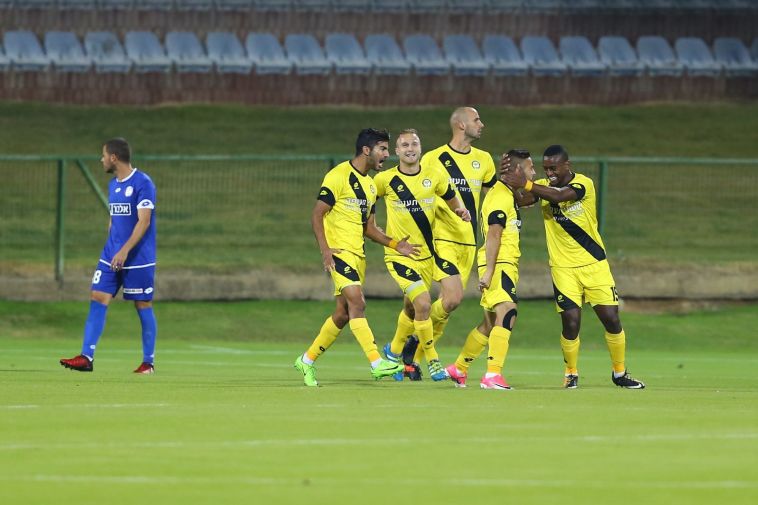 שחקני נתניה מברכים את דיא סבע אחרי השער המהיר שכבש (לירון מולדובן)