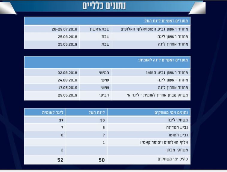 מנהלת ליגת העל בכדורגל פרסמה את מועדי תחילת וסיום ליגת העל והליגה הלאומית לעונת 2018/19. כמו כן פורסמו מועדי תחילת משחקי גביע הטוטו בליגת העל ובלאומית ומשחק אלוף האלופים.