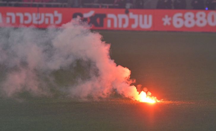 אבל הפארסה הגדולה אירעה בפתיחת המשחק. למרות הרשתות המיוחדות שהותקנו לראשונה מאחורי שערים 5-4 ו-11-10, אוהדי שתי הקבוצות השליכו עשרות אבוקות שהצליחו לחורר את הרשתות בקלות, לעבור אותן ולחדור למשטח, והמשחק הופסק ל-12 דקות בטרם חודש עקב העשן הכבד.