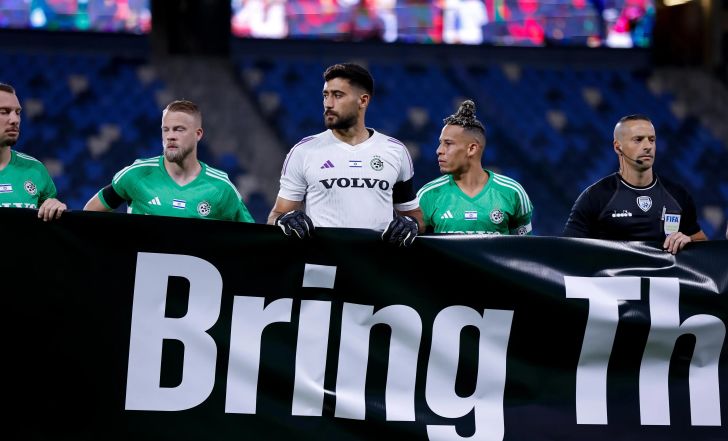שחקני מכבי חיפה עם שלט הקורא להחזרת החטופים. צ'ארון שרי, דניאל סונדגרן לא מחזיקים | מאור אלקסלסי