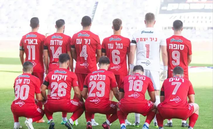 14:15: הפועל חיפה הציגה את הרכב הקבוצה למפגש מול הפועל תל אביב עם תמונות של חטופים כשמקדימה רומי גונן, בתו של אוהד הקבוצה שאף מתארח במשחק בבלומפילד. (שלמה וייס)