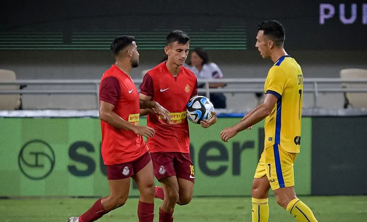 אדיר לוי (מימין) עם שלו הרוש שחקני מ.ס. אשדוד מול ערן זהבי שחקן מכבי תל אביב | אריאל שלום