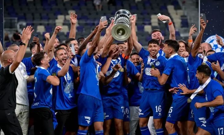 תומר לוי קפטן מכבי פתח תקוה מקבל את גביע המדינה מידי נשיא המדינה יצחק הרצוג
