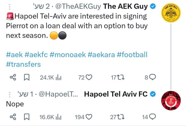 יוזר בטוויטר בשם "The AEK guy" צייץ ברשת X (לשעבר טוויטר) שהפועל תל אביב מעוניינת בהחתמת פרנזי פיירו מא.א.ק בעסקת השאלה עם אופציית רכישה, אלא שהאדומים השיבו לאותו ציוץ ("Nope") ומיהרו להכחיש את השמועה לפני שהיא מתפשטת ברשתות החברתיות.