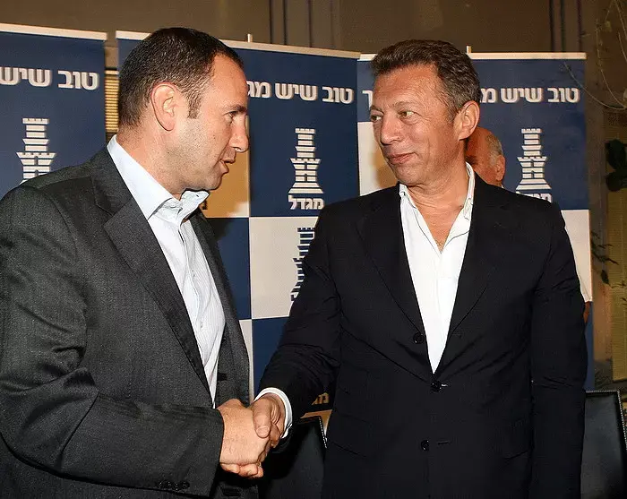 ארקדי גאידמק לוחץ את ידו של יו"ר הפועל ירושלים דני קליין | שרון בוקוב