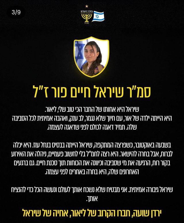 שועה כתב: "שיראל היא אחותו של החבר הכי טוב שלי, ליאור. ילדה של אור, עם חיוך שלא נגמר, לב ענק ואהבה אמיתית לכל הסביבה. היא תמיד דאגה לכולם לפני שדאגה לעצמה. ב-7 באוקטובר, כשפרצה המתקפה, שיראל הייתה בבסיס בנחל עוז. היא הייתה יכולה לברוח, אבל בחרה להישאר. היא רצה לחמ"ל בלי לחשוב פעמיים, ניהלה את האירוע בקור רוח, הרגיעה את מי שסביבה וכיוונה את הכוחות תוך סכנת חיים. גם ברגעים האחרונים שלה היא בחרה באחרים על פני עצמה. שיראל גיבורה אמיתית. אני מבטיח שלא נשכח אותך לעולם ונעשה הכול כדי להנציח אותך".