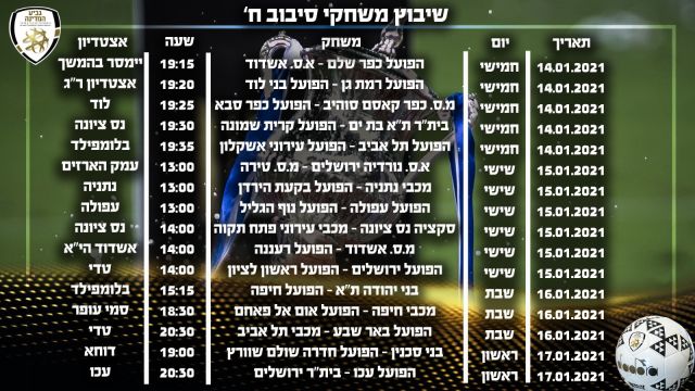 בתוך כך, ההתאחדות פרסמה היום גם את שיבוצי המשחקים לסיבוב ח' בגביע המדינה שיתקיימו בתאריכים 14-17.1. ההתמודדות הראשונה שתצא לדרך תהיה על טהרת הליגות הנמוכות, בין הפועל כפר שלם להפועל אדומים אשדוד ביום חמישי (14.1), ותמונת שמינית הגמר תיסגר ביום ראשון (17.1) כשהפועל עכו תארח את בית"ר ירושלים. בתווך, מכבי חיפה תארח את הפועל אום אל פחם בשבת (15.1) לשחזור שמינית הגמר מהעונה שעברה.
