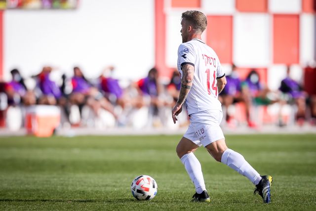 דקה 36: קלי שחרר בעיטה מרחוק שנבלמה בדרך על ידי שחקן הפועל חיפה.