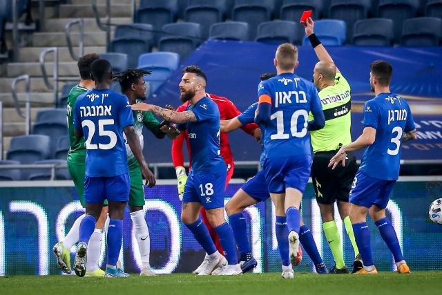 בדקה ה-31 תקרית הזויה התירה את קריית שמונה בעשרה שחקנים. מכבי חיפה ביצעה תרגיל בכדור חופשי, שהסתיים בידיים של דז'יוגאס ברטקוס. יאניק וילדסחוט ועופרי ארד הפריעו לשוער ק"ש לשחרר את הכדור, והליטאי התעצבן ובעט את הכדור על וילדסחוט. מיד השופט דניאל בר נתן שלף לעברו של ברטקוס אדום ולעבר ההולנדי צהוב, וגם לאחר בדיקת VAR אושרה הרחקת השוער. השוער הצעיר נדב זמיר נכנס אל בין הקורות והחליף את מייקל אמאנגה.