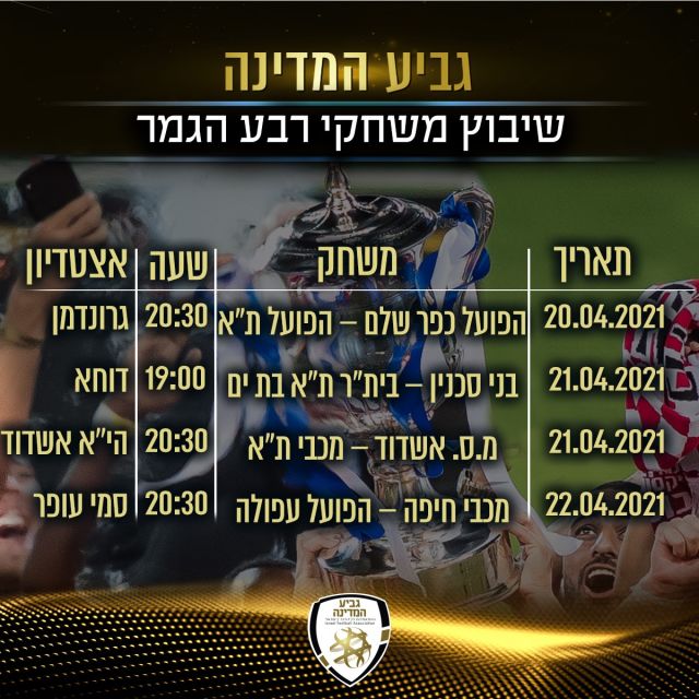 מעבר לכך, גם מועדי המשחקים במסגרת רבע גמר גביע המדינה פורסמו הערב: הפועל כפר שלם תארח את הפועל תל אביב ביום שלישי ה-20 באפריל (20:30), בית"ר תל אביב/בת ים תעלה למשחק חוץ נגד בני סכנין בערב שאחרי (19:00) וברביעי ה-21 בחודש הבא ייערך המשחק המרכזי בשלב שמונה האחרונות, בין מ.ס אשדוד למכבי תל אביב באצטדיון הי"א (20:30). לסיום, מכבי חיפה תארח את הפועל עפולה יממה לאחר מכן ב-20:30.
