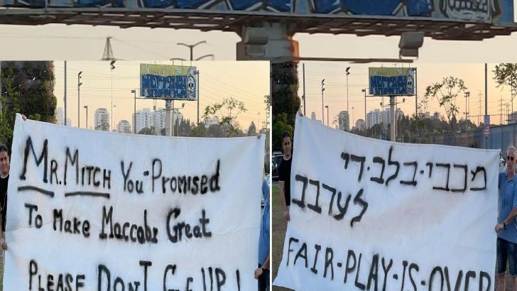 האוהדים הניפו שלט עם מסר לבעלים מיטש גולדהאר: "מר מיטש, הבטחת לעשות את מכבי גדולה, בבקשה אל תוותר!". שלט אחר קרא: "מכבי בלב, די לערבב. הפייר פליי נגמר".