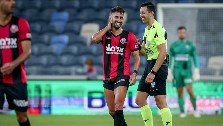 שחקן הפועל חיפה אלון תורג'מן עם השופט אביעד שילוח | מאור אלקסלסי