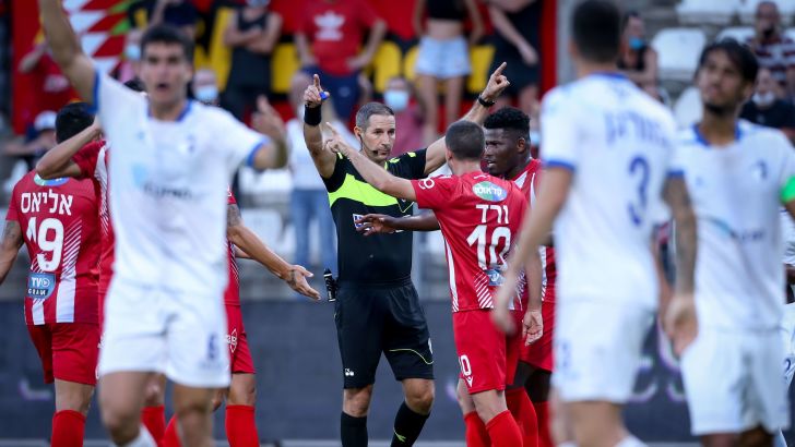 השופט איתן שמואלביץ' ליד שחקני הפועל תל אביב | מאור אלקסלסי