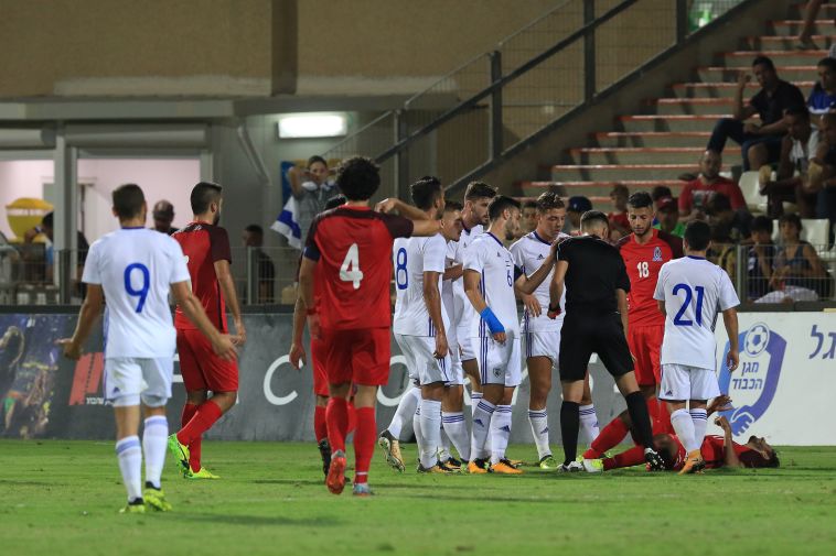 דקה 26 – ישראל בעשרה שחקנים: נטע לביא ביצע עבירה קשה באמצע המגרש, השופט היה קרוב ושלף לו כרטיס אדום.