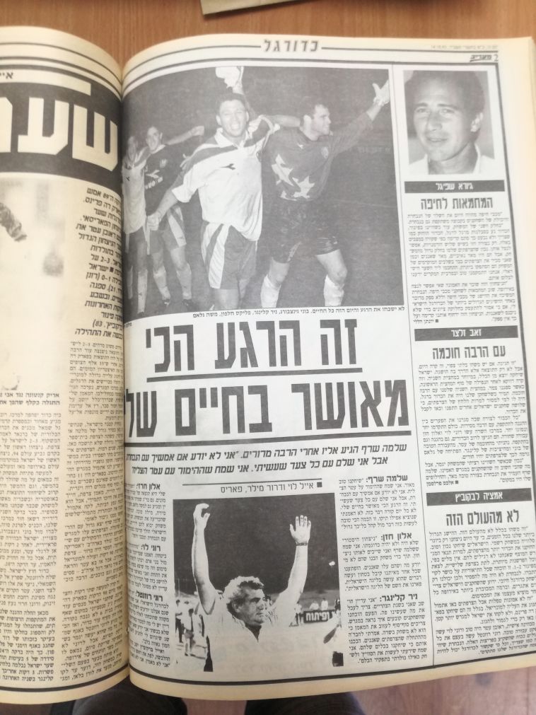 כשהתאוששתי, פתחתי דף חדש, ניסיתי לשרבט בו משהו ראוי, אך כשהרמתי את הראש כעבור כמה דקות ראיתי את ראובן עטר שולח כדור אל בין החיבורים וקובע את הניצחון הסנסציוני ביותר בתולדות נבחרת ישראל. הפעם כבר לא קרעתי את הנייר, אלא קפצתי לאוויר בשאגה והשלכתי את המחברת כולה לכר הדשא בהתקף נדיר של אושר וייאוש. כשכולם רצו לחגוג, אני רצתי לחפש טלפון ציבורי מחוץ לפארק דה פרינס וצרחתי ממנו 3,000 מילה למערכת. מה בדיוק העברתי לקלדנית? עד היום אינני יודע וכנראה שלעולם לא אדע. גיליון "חדשות" מה-14 באוקטובר 93' הוא הגיליון היחיד שלא תויק בארכיון של בית אריאלה בכל שש שנותיו של העיתון.