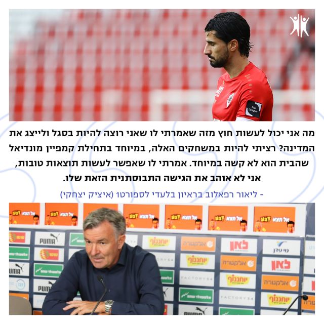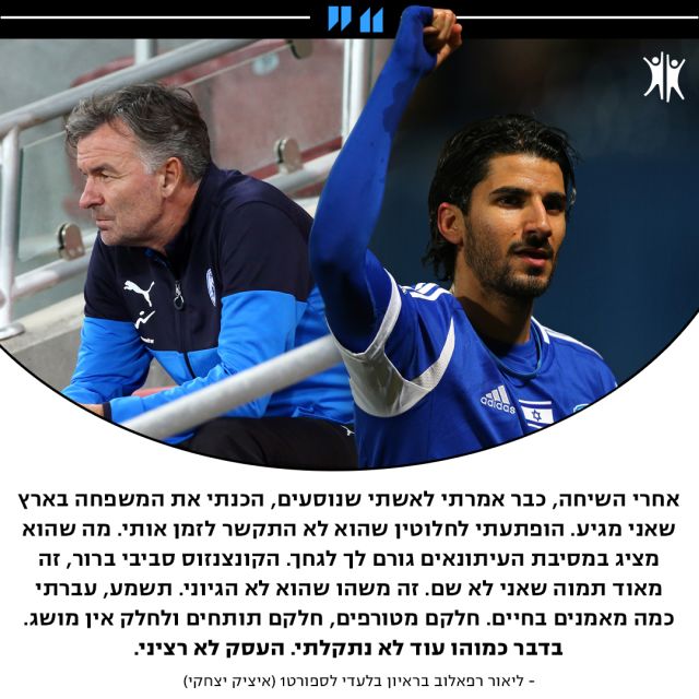 "אחרי השיחה, כבר אמרתי לאשתי שנוסעים, הכנתי את המשפחה בארץ שאני מגיע. הופתעתי לחלוטין שהוא לא התקשר לזמן אותי. מה שהוא מציג במסיבת העיתונאים גורם לך לגחך. הפוסט של אייל גולן? הקונצנזוס סביבי ברור. זה מאוד תמוה שאני לא שם. זה משהו שהוא לא הגיוני. תשמע, עברתי כמה מאמנים בחיים. חלקם מטורפים, חלקם תותחים ולחלק אין מושג. בדבר כמוהו עוד לא נתקלתי. העסק לא רציני".