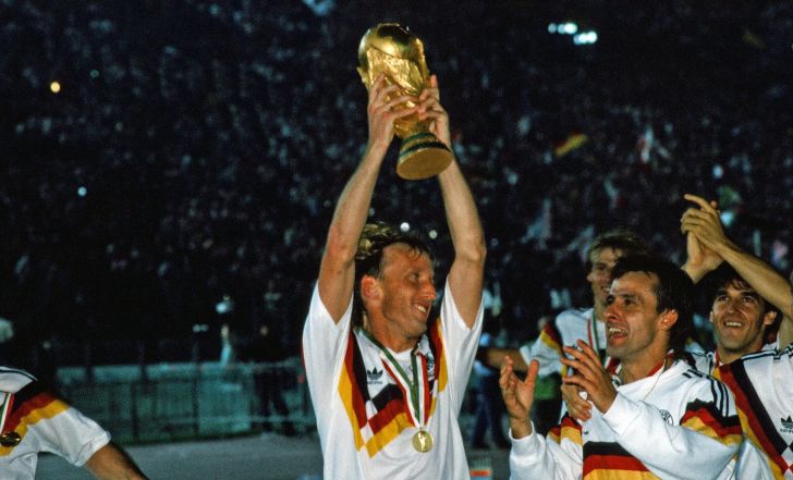 אנדראס ברמה מניף את הגביע העולמי ב-1990, אחרי הניצחון של מערב גרמניה על ארגנטינה | רויטרס