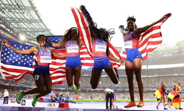 הרביעייה של ארה"ב הצליחה להחזיר את התואר האולימפי לשורותיה ולזכות בזהב ה-12 בריצה הזו, ואחרי ששקארי ריצ'רדסון הצילה אותה במוקדמות – היא שוב כיכבה בגשם השוטף בצרפת: כשקיבלה את המוט רביעית ואחרונה, ארה"ב הייתה מדורגת רביעית, אבל שקארי הצליחה לתת פיניש מדהים ולזכות בזהב ראשון בקריירה. האמריקאיות קבעו זמן של 41.78 שניות, והקדימו את בריטניה (41.85) ואת גרמניה (41.97), כאשר ג'מייקה החסרה רק במקום החמישי.